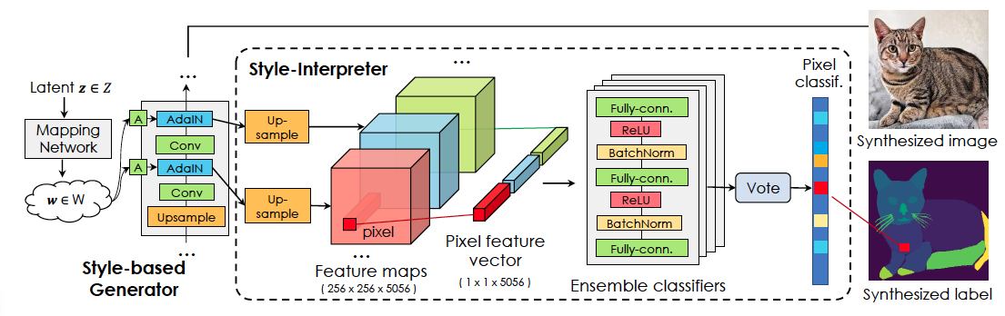 - Style-Interpreter: StyleGAN의 상단에 존재하는 pixel-wise feature vector 이용해⇒ human-provided labeling과 matching